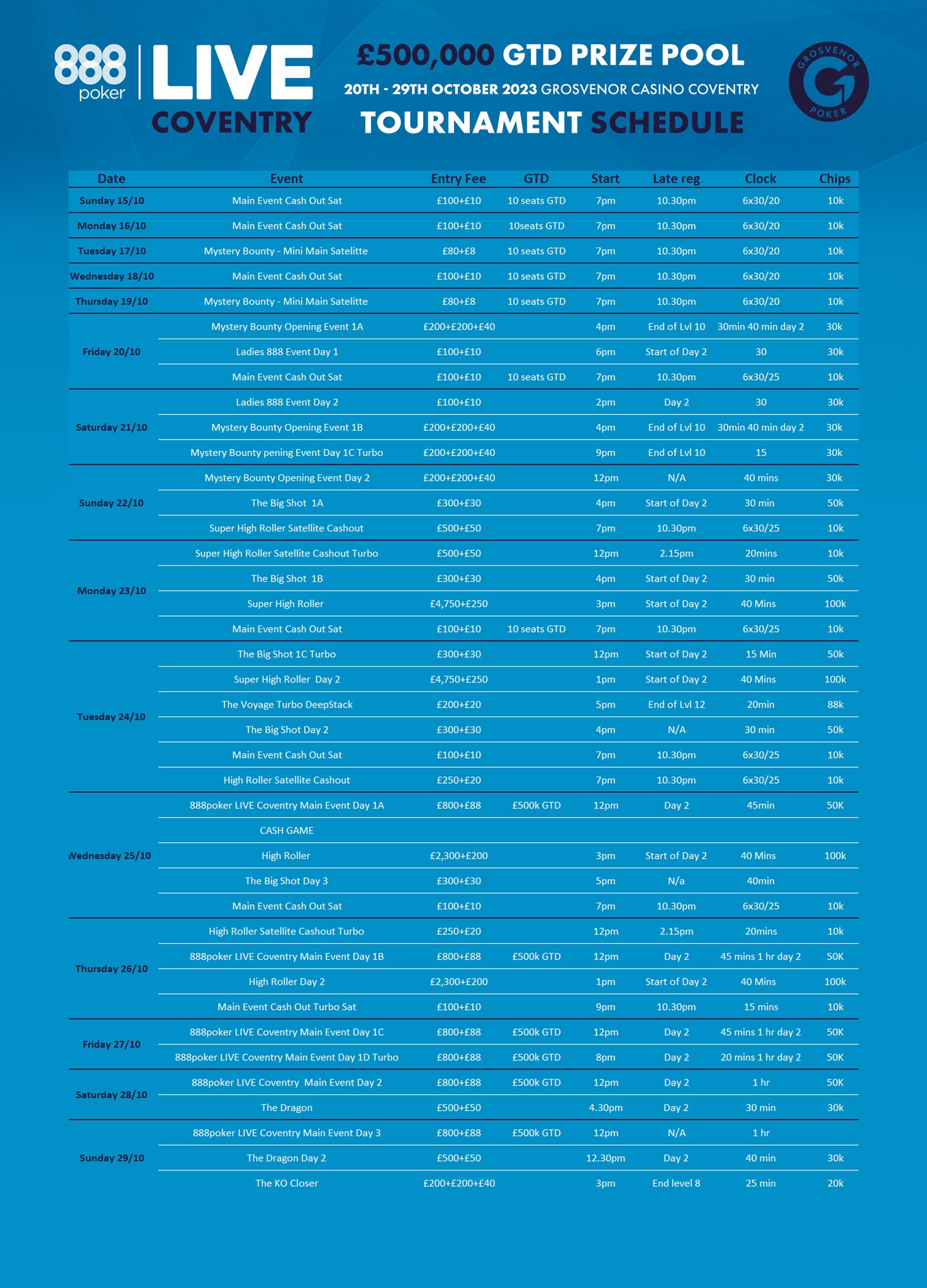 This UK stop is the first 888poker LIVE event hosted in Coventry - a culturally diverse, artsy city in the West Midlands. The casino itself is located in the Coventry Building Society Arena - an award-winning facility. The venue combines entertainment, sport, and music in a way that is accessible and unique.