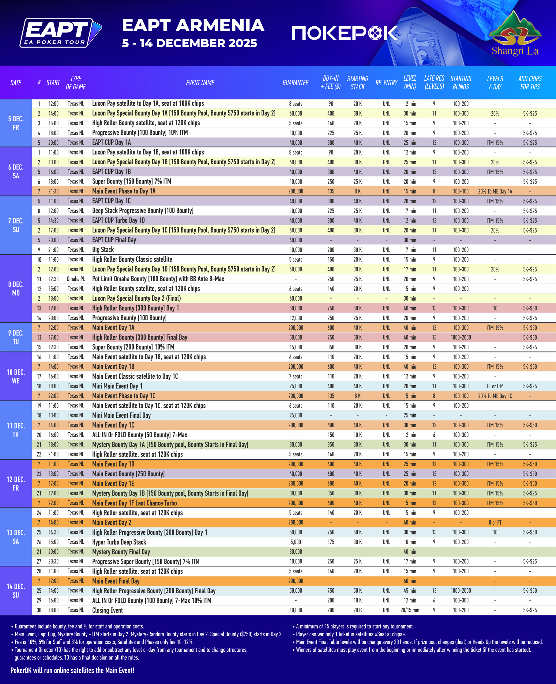 - $300 EAPT Cup (December, 5-7) | $40,000 GTD;