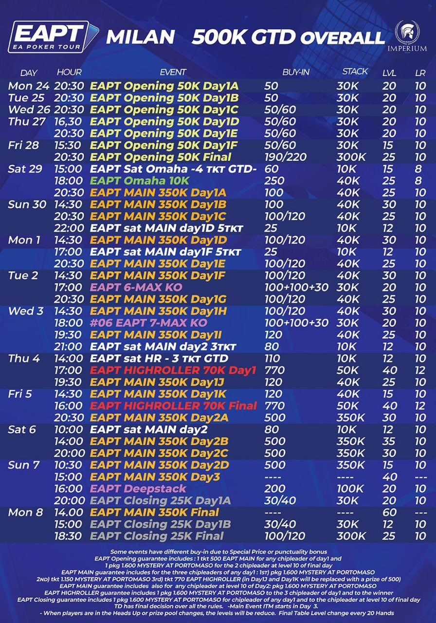 EAPT Main Event Buy-In: €100 with guarantee of €350,000.