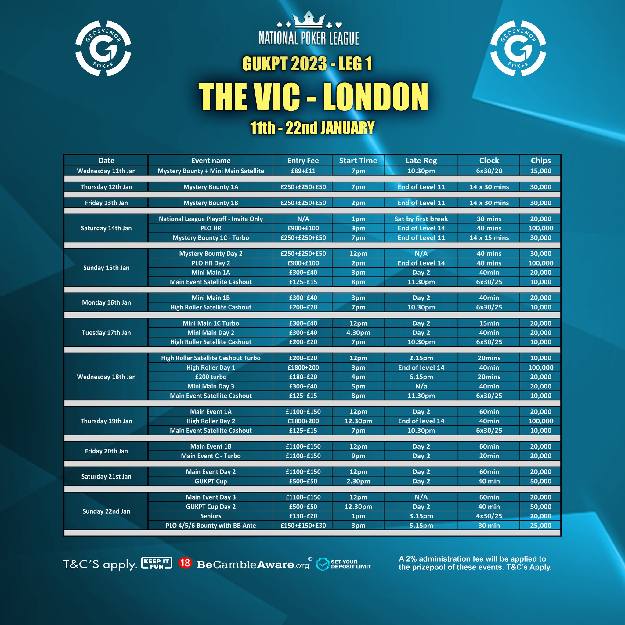 The GUKPT kicks off the 2023 schedule in London's iconic Poker Room at The Vic with the £1100+£150 Main Event.