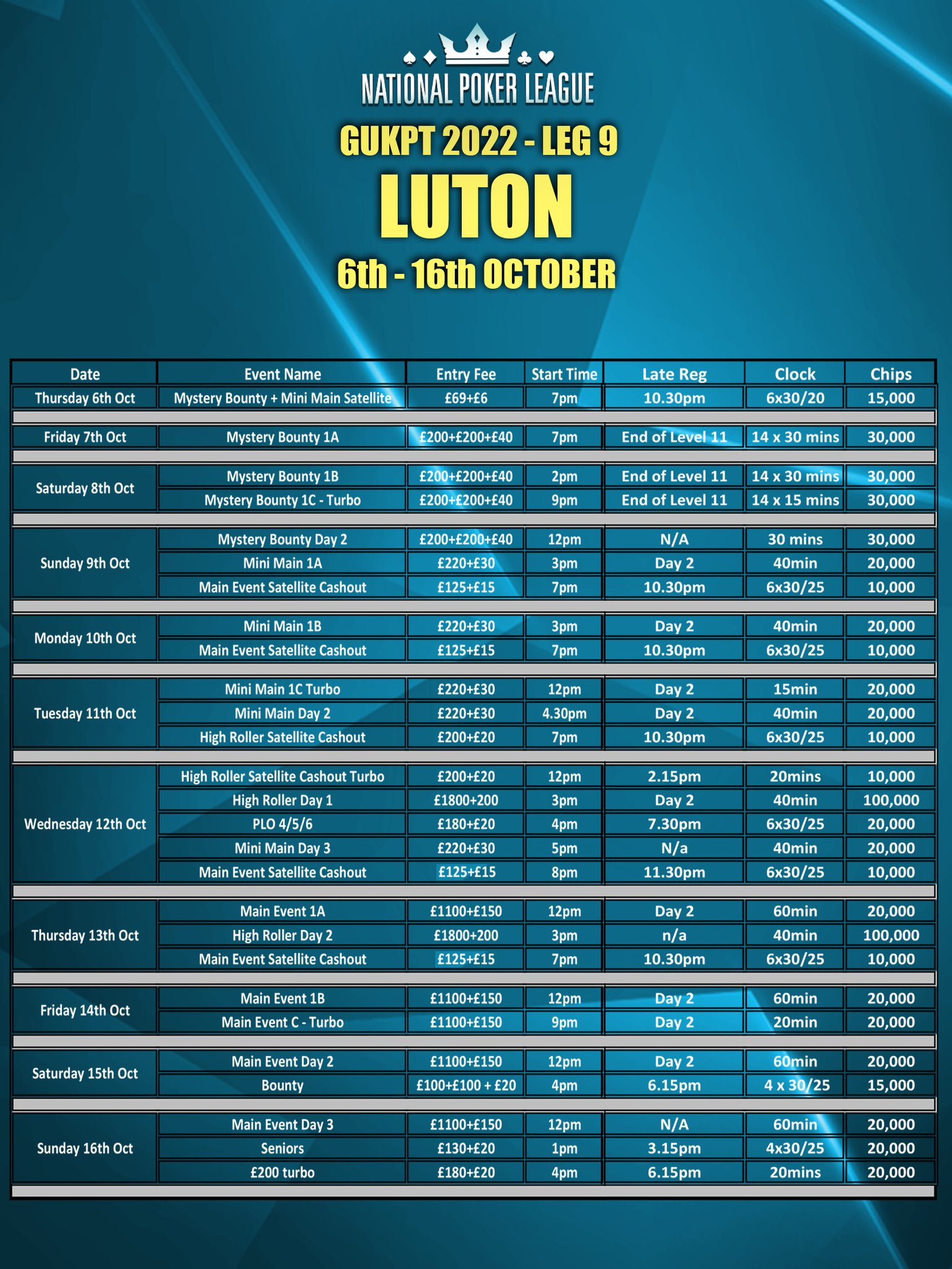 GUKPT Luton kick-offs 6th October and features the flagship GUKPT Main Event £1250, as well as Mystery Bounty, Mini Main, High Roller, Turbo, Seniors, Sattellites, and more!