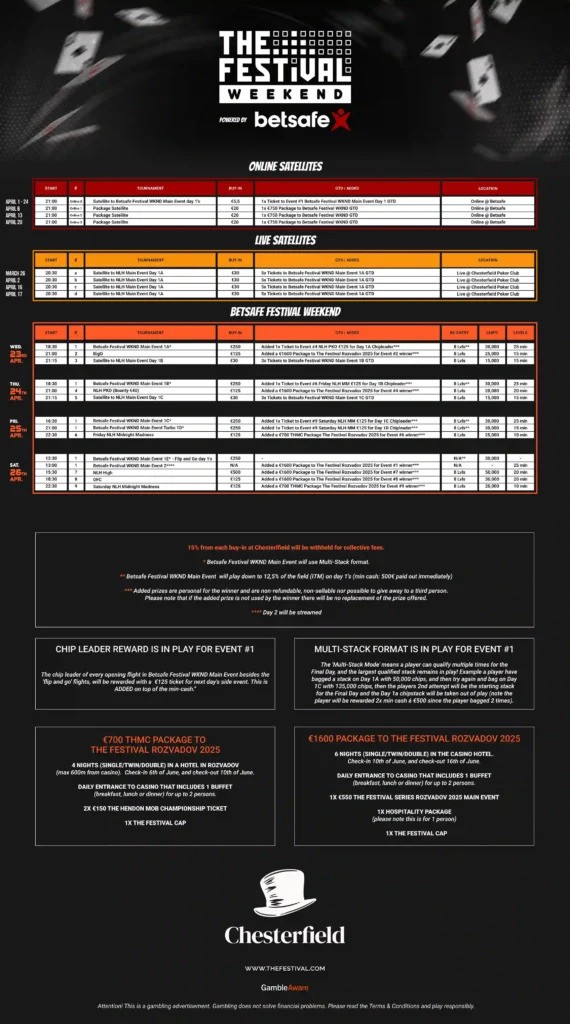 The Festival are excited to announce our very first stop of 2025! This brand-new stop has been added to the schedule, and hereby, officially reveal our newest addition, The Festival Weekend, powered by Betsafe! And that's not all, they are returning to Tallinn, Estonia! Chesterfield Poker Club will host our newest event from April 23-26!