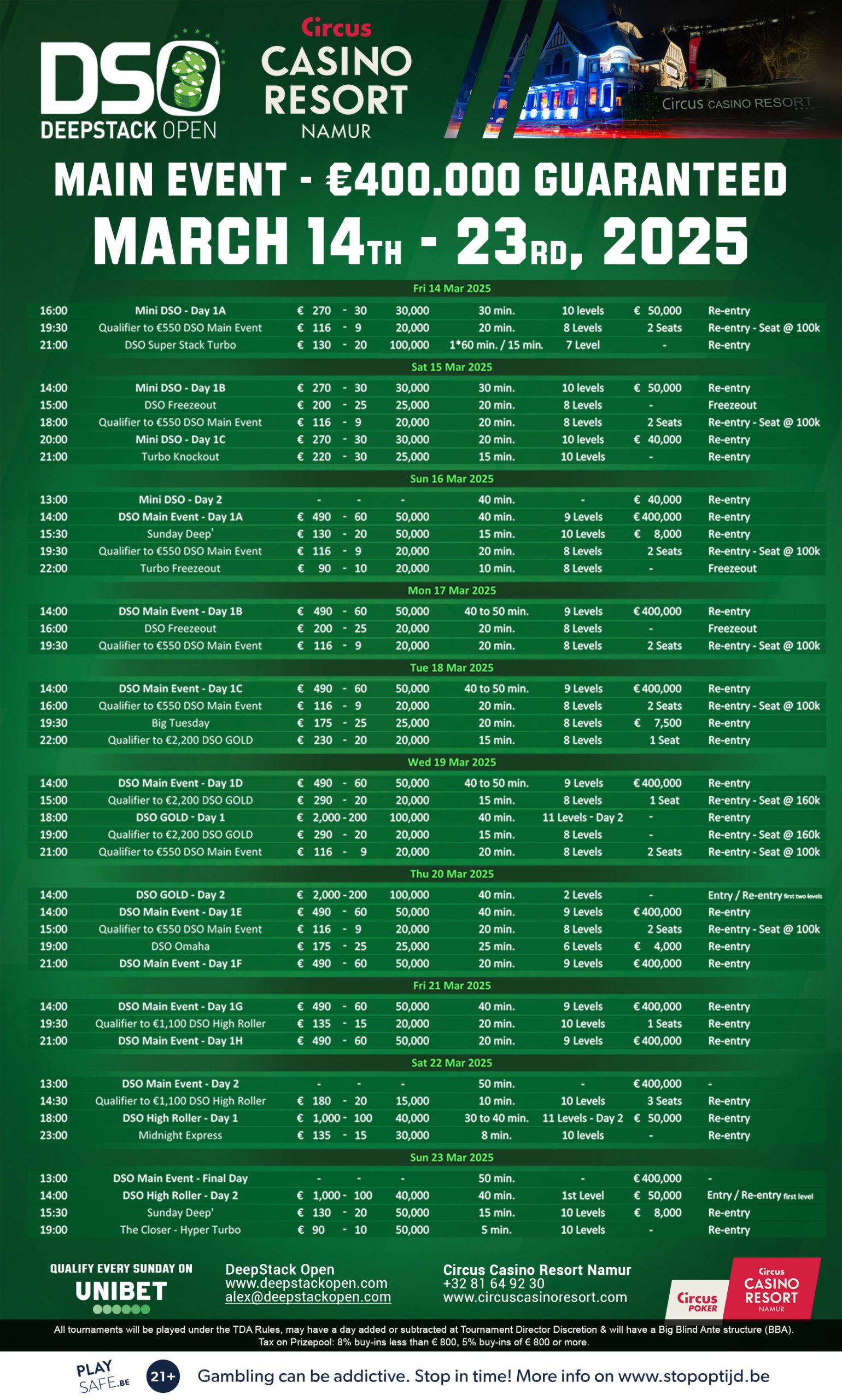 Poker enthusiasts, get ready for an unforgettable experience! Casino de Namur invites you to take part in its prestigious poker tournament, running from March 14 to 23, 2025.