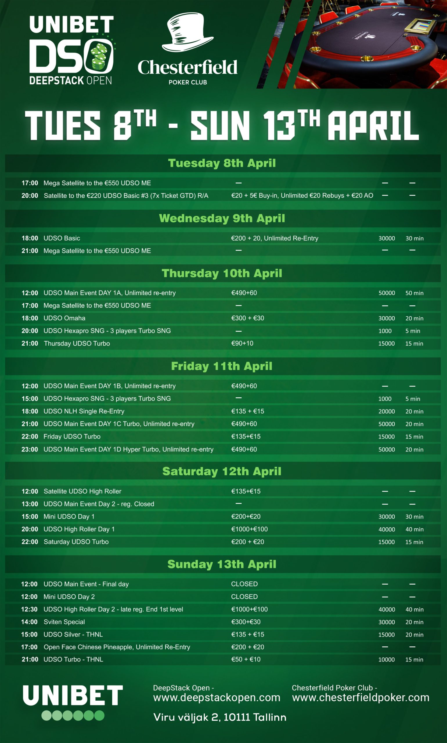 Get ready for an unforgettable week of poker at the Chesterfield Club in Tallinn! From April 8th to 13th, 2025, Chesterfield is hosting an exclusive Unibet DeepStack Open poker tournament that promises intense competition, thrilling action, and incredible prizes.