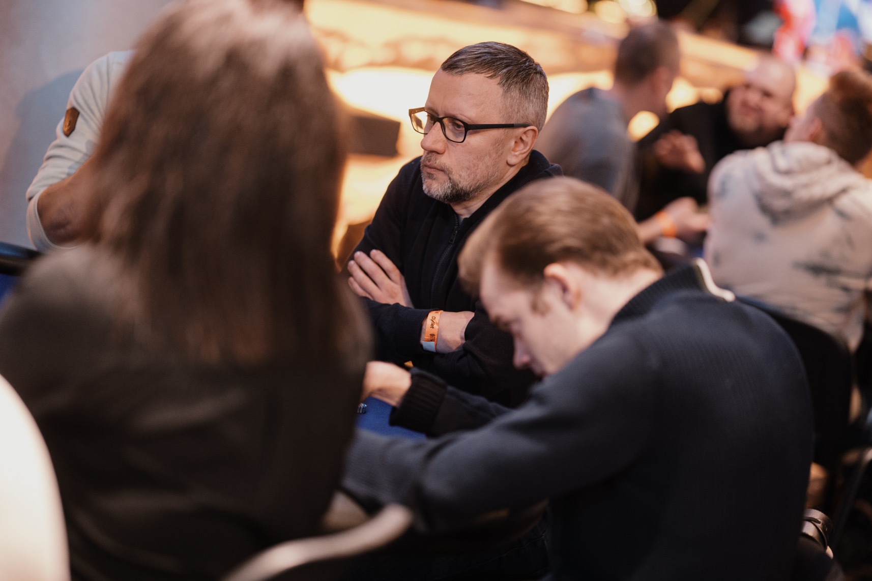 Dominik Ostrowski min-raised from the cutoff before Robertas Sakinis (pictured below) three-bet jammed for 165,000 from the big blind. Ostrowski wasted no time in calling and Sakinis just needed his hand to hold to double his stack.