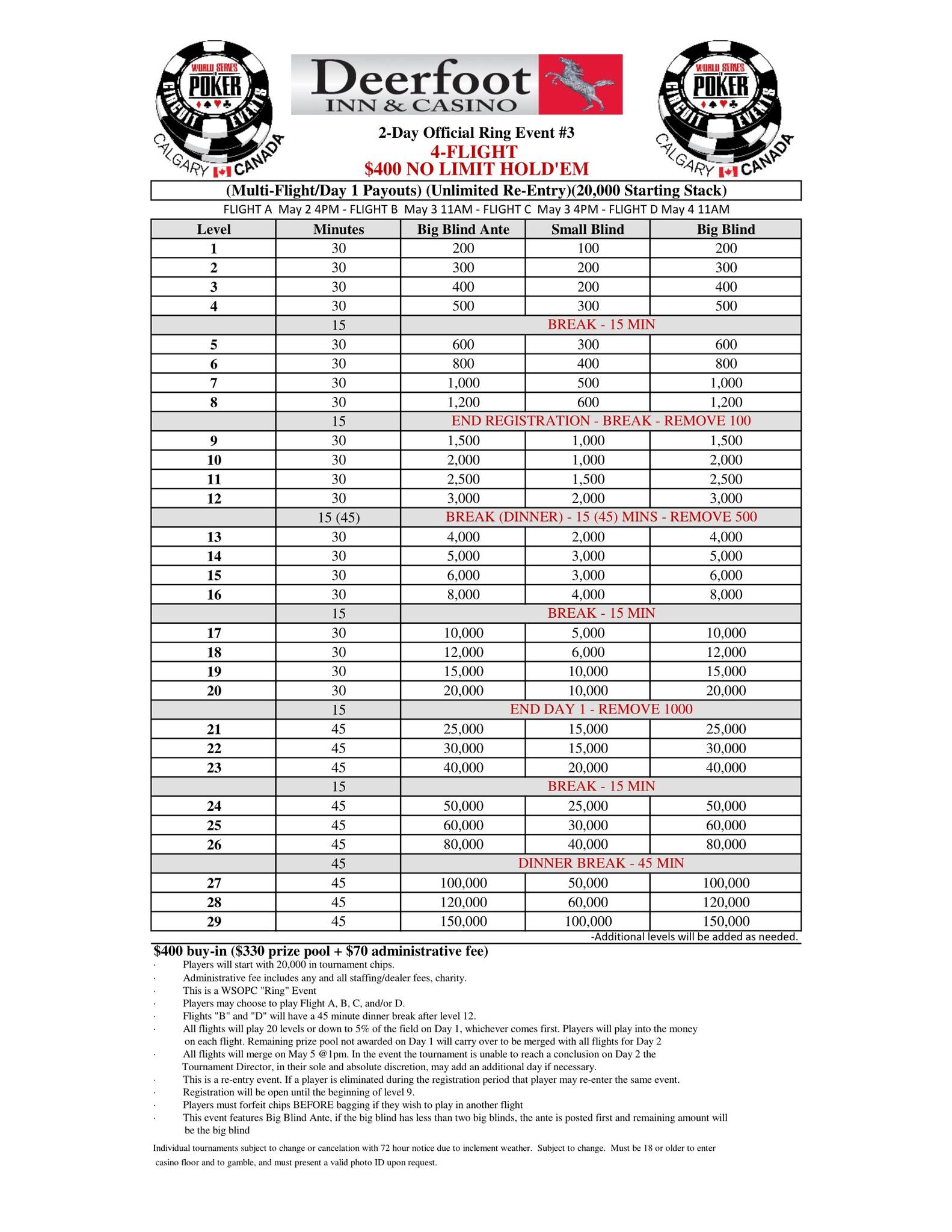 Day 1 Ends: 20 Levels or 5% of the field (Level 20 should end about 3 AM/11:30 PM)