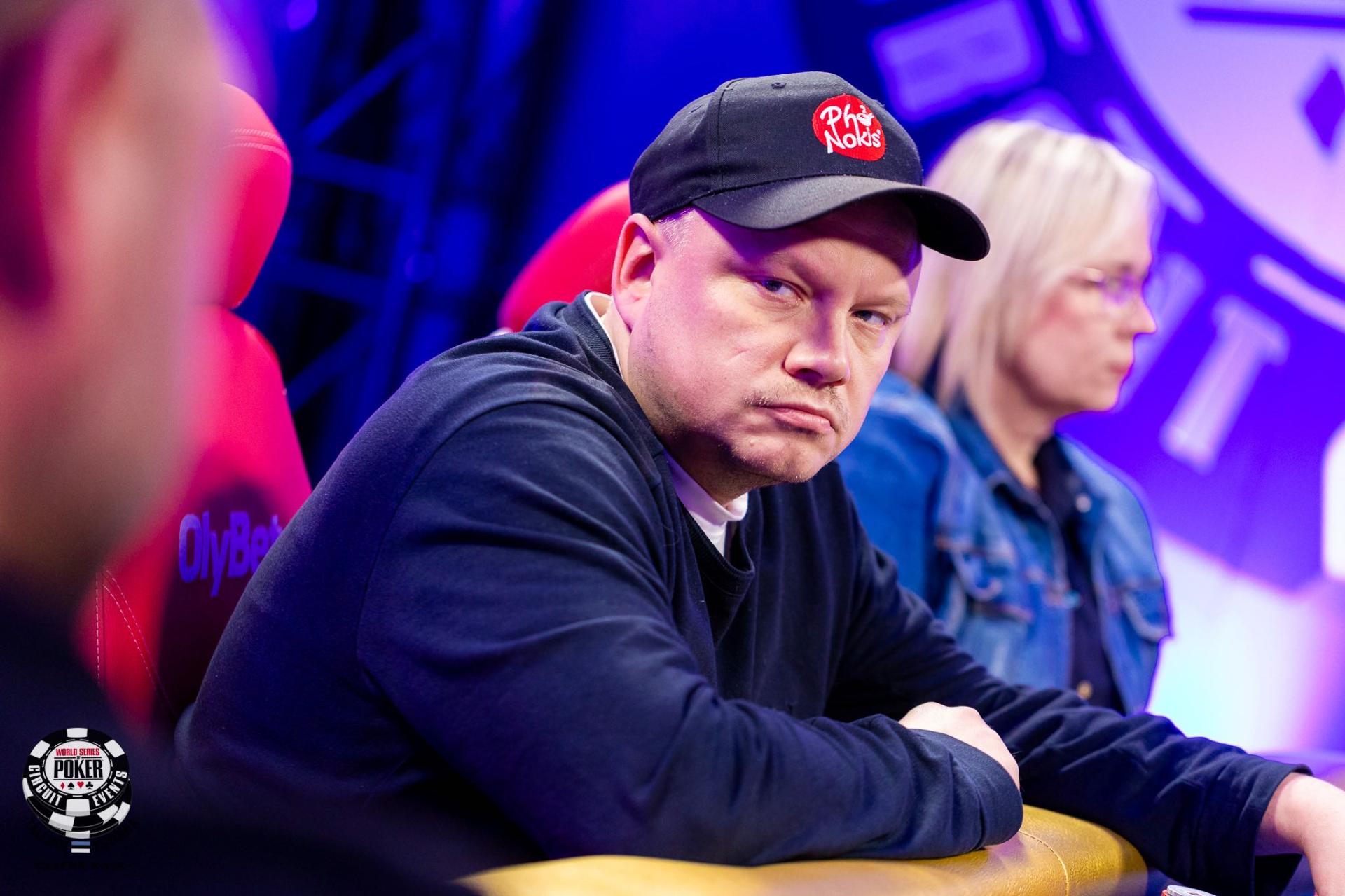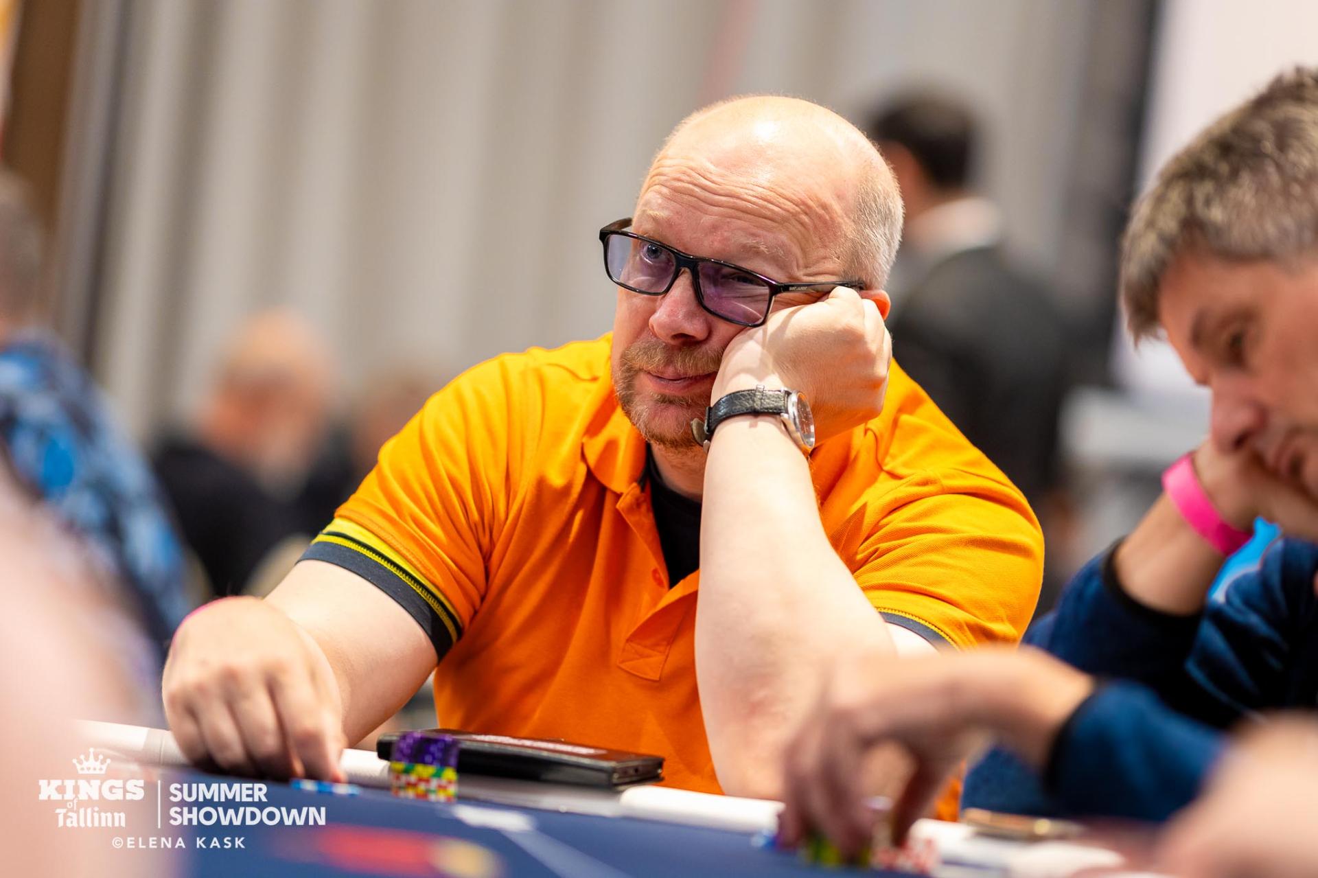 Unfortunately, Finnish poker legend Aki Pyysing (pictured below at the 2023 Kings of Tallinn Summer Showdown) is one of the players on the rail. He already quickly re-entered and we wish him the best of luck on his second Day 1b bullet.
