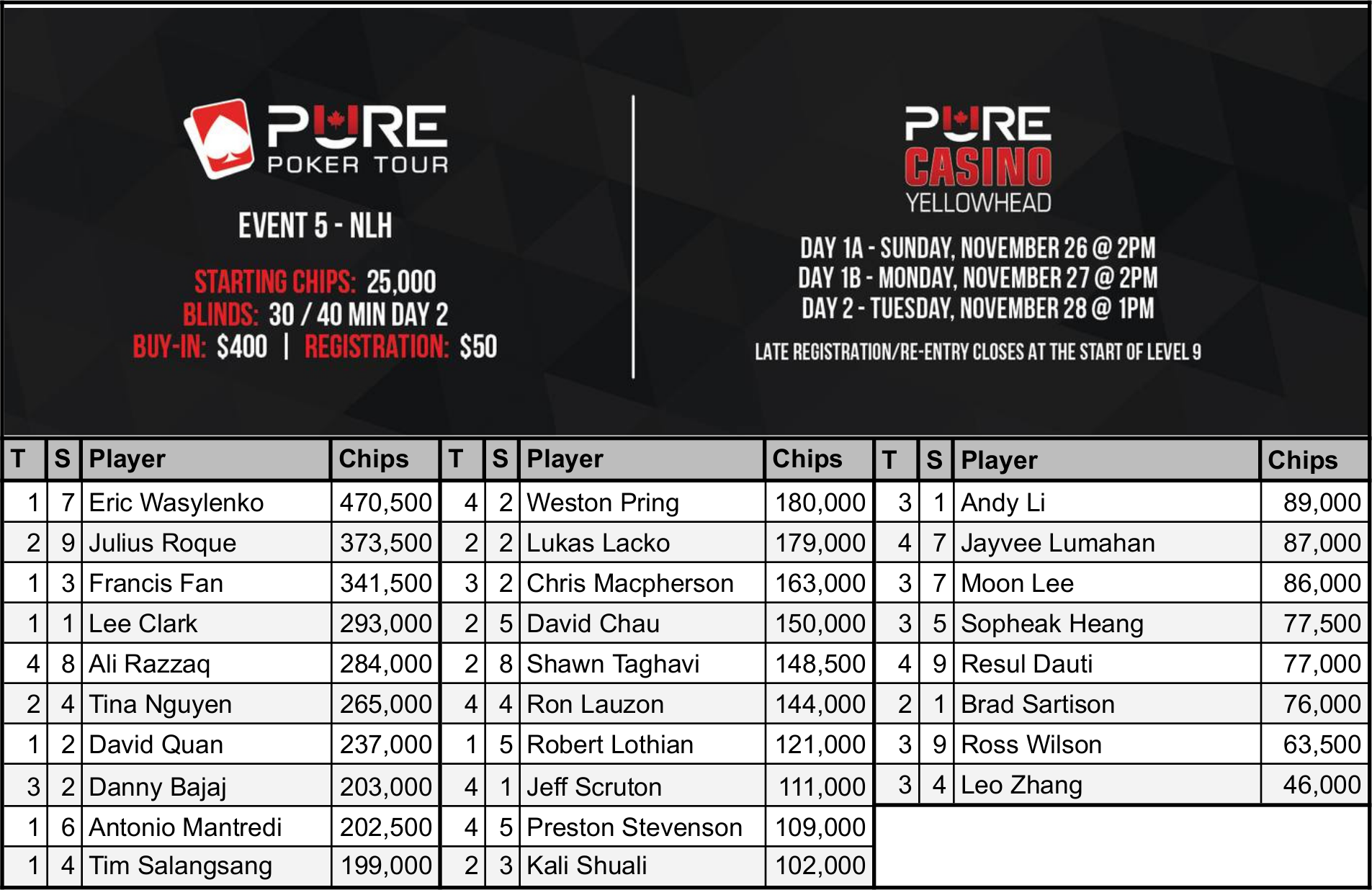 It was a bit of a storybook ending for the two starting flights in this one. Player of the Series leader Eric Wasylenko bagged the big stack on Day 1a, and will be playing the most chips to start Day 2. Wasy is in a neck-and-neck battle with Francis Fan for the top on the PoS though, with Fan just .3 points behind him, and Fan was the chip leader to end Day 1b.